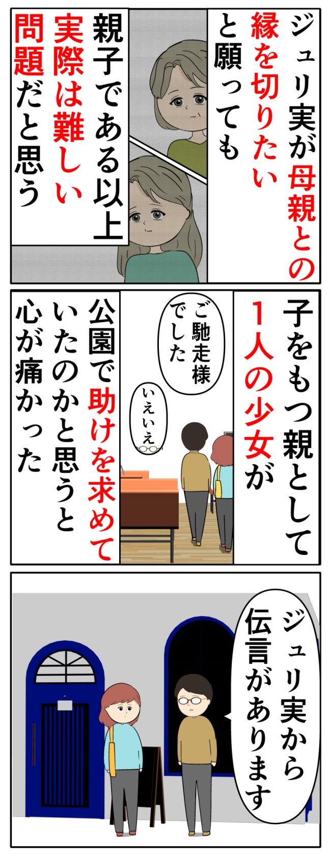 ジュリ実の過去に触れ、真っ向からジュリ実と向き合う覚悟を決めた夫。ジュリ実はトラウマの原因でもあった母と縁を切ることに決め、ジュリ実の夫は、自身の海外転勤にジュリ実を連れていくことにしました。