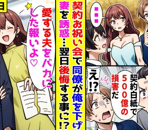 続きを読む僕はとある会社の営業部で働いています。ある日、大きな契約が取れたお祝い会が開催されることとなり、妻のAと一緒にパーティー会場へ行ったのですが……。 僕の妻に声をかける同僚 パーティ...