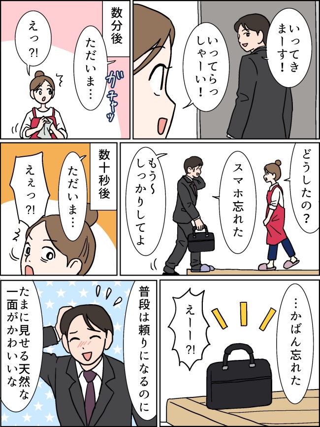 ある朝、出勤のため家を出た夫が、「スマホを忘れた」と自宅に戻ってきました。スマホを手にした夫を再度見送ると……その直後、また自宅に戻ってきた夫。どうしたの!?と思っていると、なんと先ほどスマホを取りに戻った際、仕事用のかばんを玄関に置いて、そのまま家を出てしまったよう。その天然っぷりに思わず笑ってしまいました。