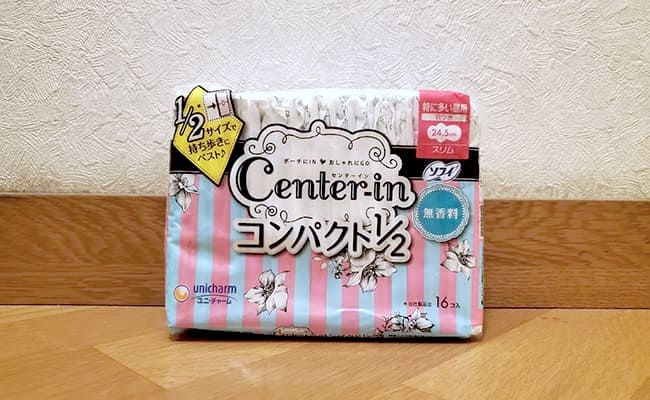 日中はユニチャームの「センターイン コンパクト1/2」を使用しています。メリットはその持ち運びのしやすさ。「センターイン コンパクト1/2」は同社のスリムナプキンの1/2のサイズなので、他のナプキンよりもたくさんポーチに入ります。