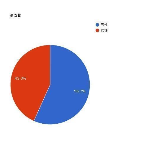 男性が56.7%、女性が43.3%と他のマッチングアプリに比べてみると男女のバランスが良くなっています。