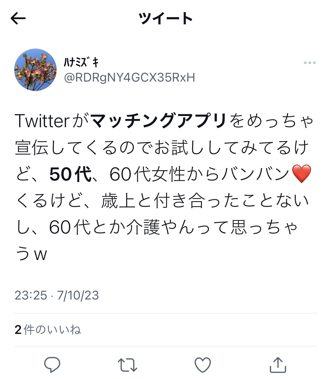上記の「Twitter」のツイートは、マッチングアプリ利用中の50代女性に対する男性の意見です。