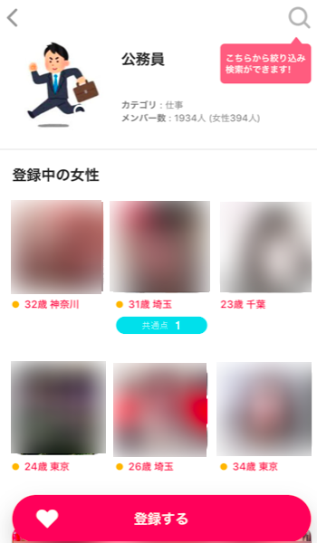 - 職業や住んでいる地域など、細かく条件を絞り込める「検索機能」