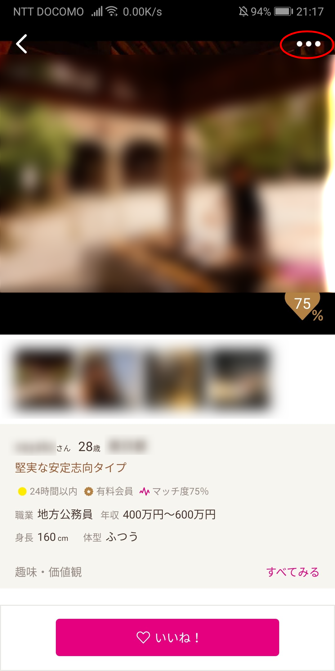 まずは非表示にしたい相手のプロフィールを開きます。そして右上の「・・・」をタップします。